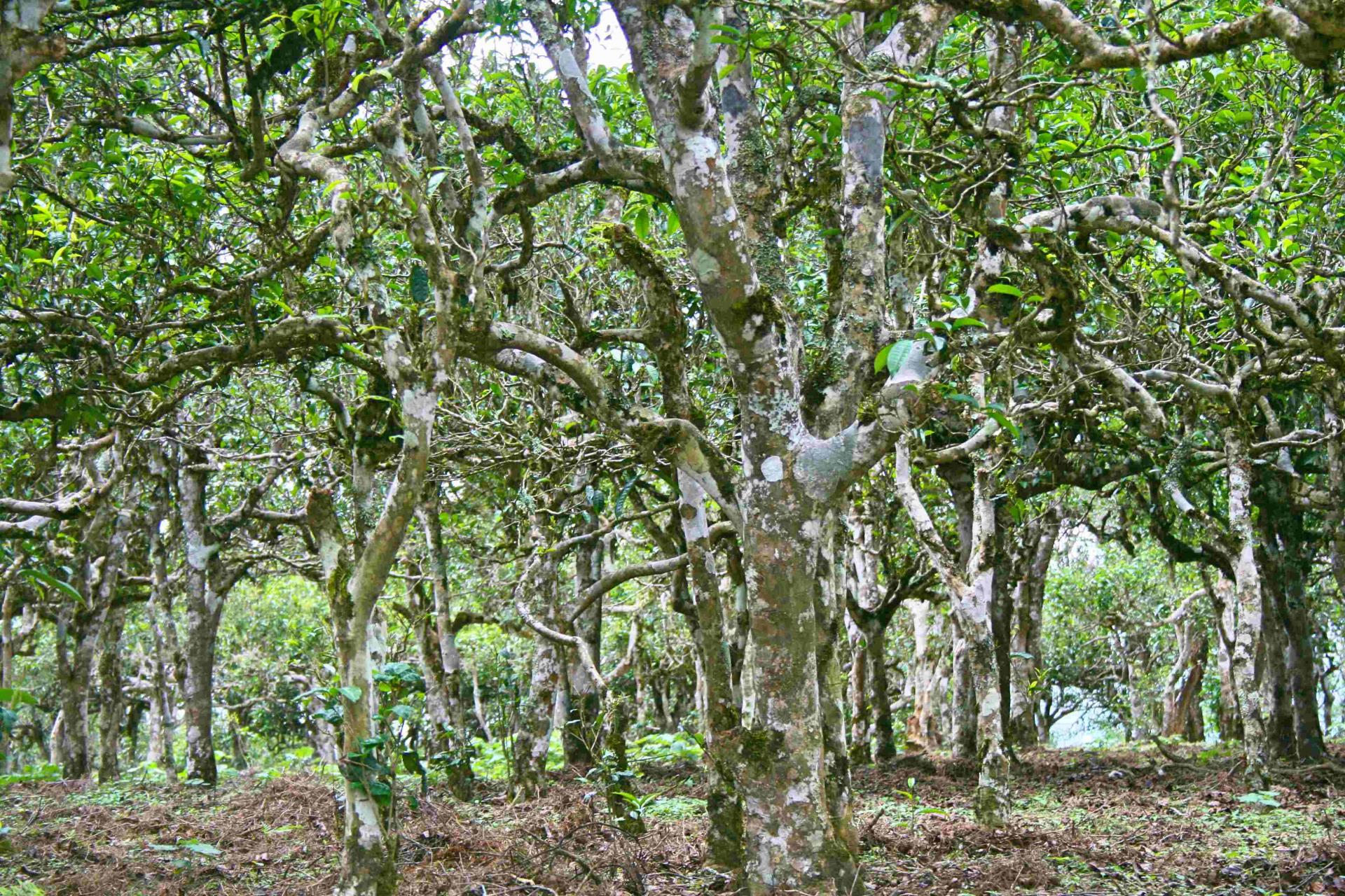 在賀開古茶山,古茶樹平均密度一般在132株/畝左右,基部圍0.82米左右,樹幅約3*2.5米,樹高平均在2.5米。管理上不施任何化肥、農(nóng)藥,僅除去茶園中的高草,平均單產(chǎn)30千克/畝。在海拔1600米的曼弄新、老寨交界處生長著10多株大茶樹,是賀開“茶王”樹的圣地。其中一株最大的古茶樹,樹型喬木,樹高3.8米,樹幅7.3*6.55米,基部圍2.12米,樹齡1300年左右,被當(dāng)?shù)厝朔Q為“茶王”。古茶樹生長在村寨附近樹木茂盛、陰覆良好的自然環(huán)境中。還有的生長在村民的房前屋后,古茶樹長勢旺盛,構(gòu)成了一幅“林中有茶,茶在寨中”人與自然和諧的古茶園景觀。